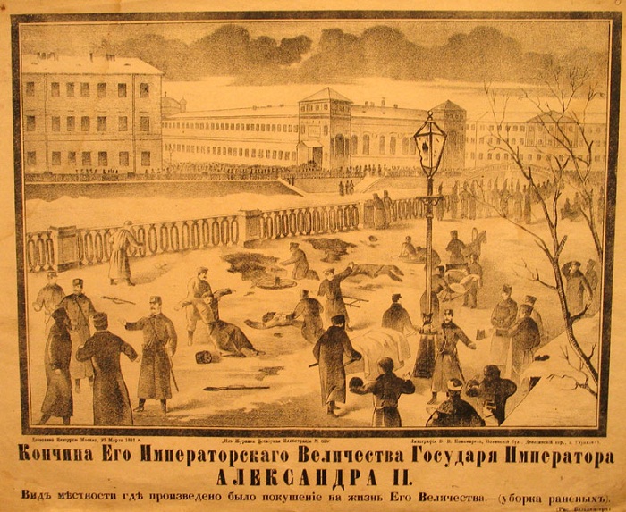 Однако, 1 марта 1881 года террористы добились своего – бомба, брошенная прямо под ноги царя, оборвала его жизнь. Подготовила покушение группа террористов-народовольцев во главе с Софьей Перовской. Утром в карету с царем, возвращавшимся из Михайловского Манежа в Зимний дворец после посещения развода войск, народоволец Рысаков бросил бомбу, но царь опять остался жив, погибли два конвойных и мальчик-разносчик. Царь вышел из экипажа и направился к раненым, в это время к нему подбежал еще один народоволец, Гриневицкий, и бросил еще одну бомбу. Александра и террориста от мощного взрыва отбросило к ограде канала.