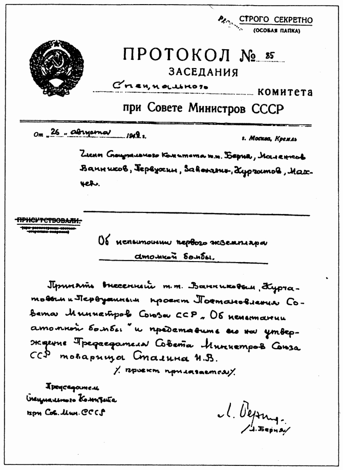 В итоге, не оставив на документе ни малейшей пометки, Сталин вернул его обратно, дав Берии лишь устное и обтекаемое указание: лети-ка, друг мой ситный, на полигон… Имелось в виду: лети и взрывай, но ничего я тебе на сей счет визировать не буду. И вот 26 августа 1949 года Лаврентий Павлович оформляет протокол заседания Специального комитета при Совете Министров СССР «Об испытании первого экземпляра атомной бомбы», в котором говорится о принятии на заседании Спецкомитета внесенного Ванниковым, Курчатовым и Первухиным проекта постановления Совмина «Об испытании атомной бомбы» и представлении его на утверждение Сталину.