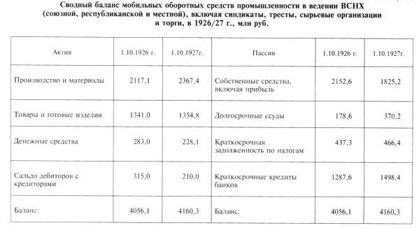 В октябре 1926 г. собственные средства в обороте, указанные в первой статье пассива, еще перекрывали потребности производственного процесса — первую статью актива. Через год у промышленности для полного обеспечения производства не хватало уже собственных оборотных фондов вместе с долгосрочными ссудами — второй статьей пассива. Другие статьи актива — готовые изделия и товары, денежные средства, коммерческий кредит (сальдо дебиторских расчетов) — покрывались краткосрочными кредитами банков и задолженностью по налоговым платежам в бюджет перед Наркомфином. Индустрия перестала быть кредитоспособной в торговых отношениях с кооперацией.