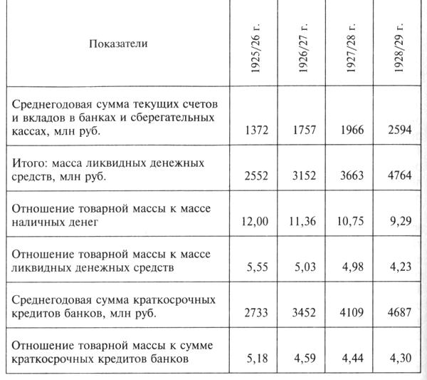 Отношение стоимости товарной массы к циркулировавшим наличным деньгам уменьшилось с 1925/26 по 1928/29 гг. на 22,6%. Пропорция между товарной массой и суммой ликвидных денежных средств за тот же период сократилась на 23,8%. Стало быть, скорость обращения наличных денег и более широкого денежного агрегата замедлилась почти на четверть. В условиях принудительно регулируемых фиксированных товарных цен снижение скорости хождения денежных знаков было тождественно концентрации у покупателей избыточных средств платежа и обострению дефицита продуктов и услуг. Оно сигнализировало о падении эффективности массы денег и результативности их эмиссии, об уменьшении покупательной способности национальной валюты. Оборот той же товарной массы требовал большего количества рублей. Показатель отношения товарной массы к сумме краткосрочных банковских кредитов также выявлял отрицательную динамику. На продвижение определенного объема товаров по всесоюзному рынку в 1928/29 г. затрачивалось в среднем на 17% больше краткосрочных кредитных ресурсов, чем в 1925/26 г.