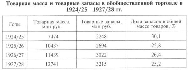 Таблица 20. Товарная масса и товарные запасы в обобществленной торговле в 1924/25-1927/28 гг.
