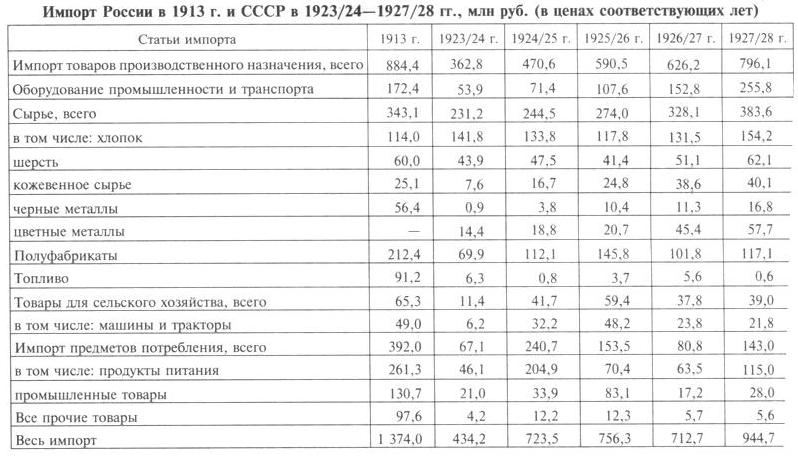 Таблица 23. Импорт России в 1913 г. и СССР в 1923/24—1927/28 гг., млн руб. (в ценах соответствующих лет)