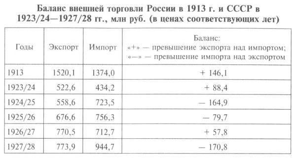 Таблица 24. Баланс внешней торговли России в 1913 г. и СССР в 1923/24—1927/28 гг., млн руб. (в ценах соответствующих лет)