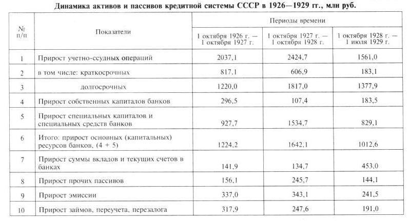 При стабильном удельном весе в балансе займов, переучетов (11,6—12,0%) и прочих пассивов (7,7—8,3%) троекратно возросла доля специальных капиталов и специальных средств банков — с 10,1% в октябре 1926 г. до 32,1% в июле 1929 г. За то же время снизились удельные веса собственных капиталов банков — с 15,9% до 11,7%, вкладов и текущих счетов — с 28,8% до 18,5%, эмиссии — с 24,7% до 18,4%. Расширению долгосрочных кредитов сопутствовал мощный приток специальных средств, предназначенных для многолетнего размещения среди клиентов.