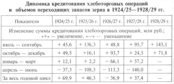 Таблица 2. Динамика кредитования хлеботорговых операций и объемов переходящих запасов зерна в 1924/25—1928/29 гг.