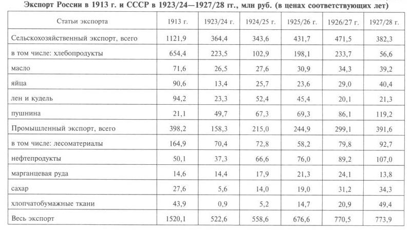 Таблица 22. Экспорт России в 1913 г. и СССР в 1923/24—1927/28 гг., млн руб. (в ценах соответствующих лет)