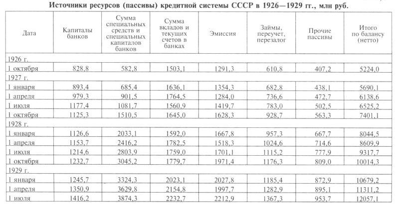 При стабильном удельном весе в балансе займов, переучетов (11,6—12,0%) и прочих пассивов (7,7—8,3%) троекратно возросла доля специальных капиталов и специальных средств банков — с 10,1% в октябре 1926 г. до 32,1% в июле 1929 г. За то же время снизились удельные веса собственных капиталов банков — с 15,9% до 11,7%, вкладов и текущих счетов — с 28,8% до 18,5%, эмиссии — с 24,7% до 18,4%. Расширению долгосрочных кредитов сопутствовал мощный приток специальных средств, предназначенных для многолетнего размещения среди клиентов.