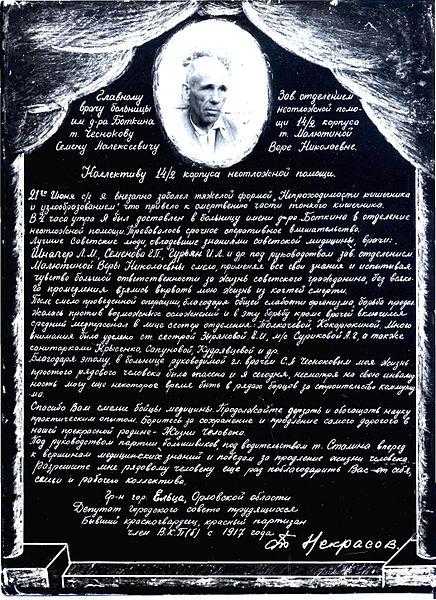 Воодушевлённые Вашим историческим докладом, приказом и наступательными действиями нашей славной Красной Армии, профессора, врачи, сёстры и санитарки больницы имени доктора С. П. Боткина единодушно решили построить на свои сбережения боевой самолёт «Боткинец» и вносят в Госбанк 100 000 рублей. Сбор средств продолжается.