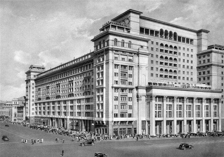 После Октябрьской революции все гостиницы были национализированы или закрыты. В 20-30-х началось строительство первых советских гостиниц, в ходе так называемой реконструкции центра Москвы. В 1930 Охотный ряд с его магазинами, кабаками и церквями был разрушен, и на этом месте была построена унылая громада гостиницы Москва. В пятидесятые годы открылись гостиницы Алтай, Заря, Золотое Кольцо, Останкино, Украина, и Ленинградская. В последующие годы открывались новые крупные гостиницы в Москве, особенно к Олимпиаде-80, среди них – гостиница Салют, гостиничный комплекс Измайлово, гостиница Космос и другие. Эти гостиницы были построены за пределами Садового кольца, ближе к окраинам Москвы.