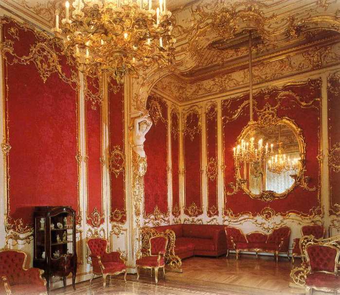 Лепнина превращается в легкий, полный движения узор. Мастера особенно охотно изображали в эту эпоху амуров и ангелочков, задрапированные ткани, букеты, гирлянды из фруктов, огромные валюты, картуши (декоративный щит или свиток), тяжелые, вычурные карнизы. Лепной декор часто превращался в своеобразную раму для большого потолочного плафона или настенного панно. Насыщенность такими украшениями сочеталась со сдержанным и строгим оформлением остальных поверхностей. Примеры такого декора можно найти во дворце Монплезир в Петергофе.