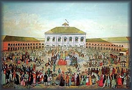 - Первыми на Руси упоминаются крупные торги Х-ХП вв. в Великом Новгороде и ярмарки в Архангельске. После освобождения от монголо-татарского ига, с образованием единого русского государства и возрождением внутреннего рынка на Руси образуется целая «гильдия торговых людей», установившая связи с иноземными городами. Регулярные ярмарки в России известны с середины XIV в. (в т.ч. знаменитая Макарьевская ярмарка).