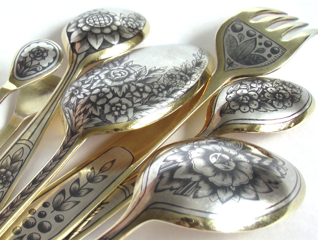 История столового серебра в России насчитывает не одну сотню лет. Серебряные кубки и ковши еще в Древней Руси довольно часто являлись предметом царских пожалований или особых подношений. Конечно, это было серебро не высочайшей пробы, но все же по тогдашним меркам считалось одним из самых дорогих подарков. Официально первый столовый сервиз был изготовлен мастерами – ювелирами в 1711 году по прямому указу царя Петра 1. Именно в том году было выпущено столовое серебро с эмалью по скани, которое является сугубо русским явлением, до этого времени нигде не производимое. В других странах было принято производить столовое серебро декорированное эмалью.
