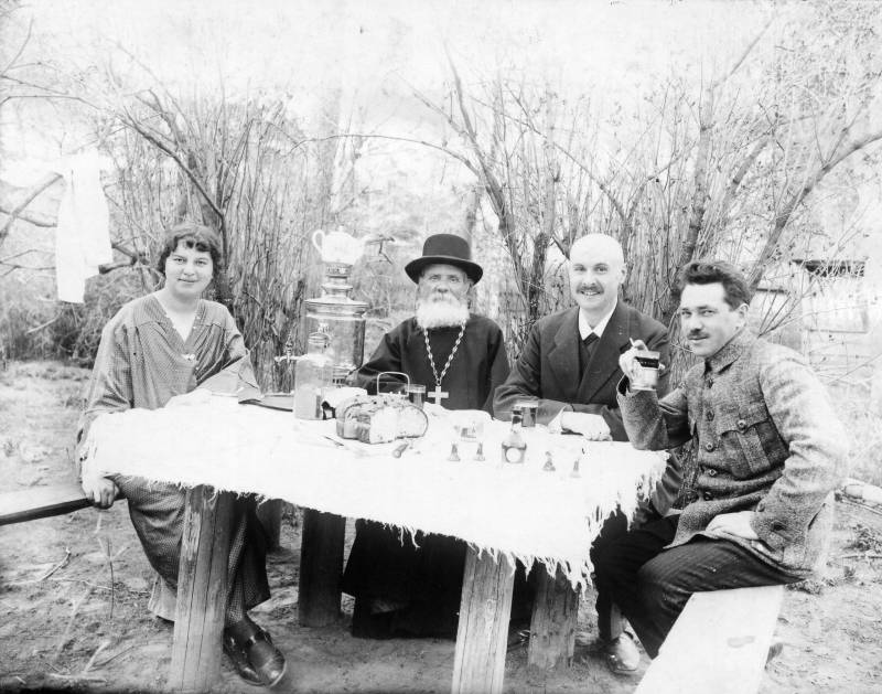 Ольга Фёдоровна, священник Далматов, А. И. Бренинг и К. Далматов во время праздника Пасхи. Свияжск. 1915