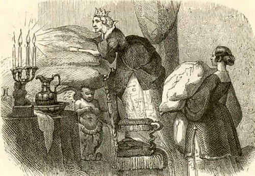 В эпоху Возрождения постель представителя богатого сословья была сложным сооружением, которое состояло из основания – волосяного матраса, который покрывался грубой холщевой тканью. На это сооружение стелились одна на другую три кружевные простыни с вышивкой, на них клали множество разных по размеру подушек. Поверх подушек укладывали одеяло. Пододеяльники тогда еще не придумали, поэтому их роль играла простыня, которая просто подкладывалась под одеяло. Все постельные принадлежности украшались не только узорной вышивкой и кружевами – на них, кроме этого, наносились фамильные гербы и инициалы владельца.