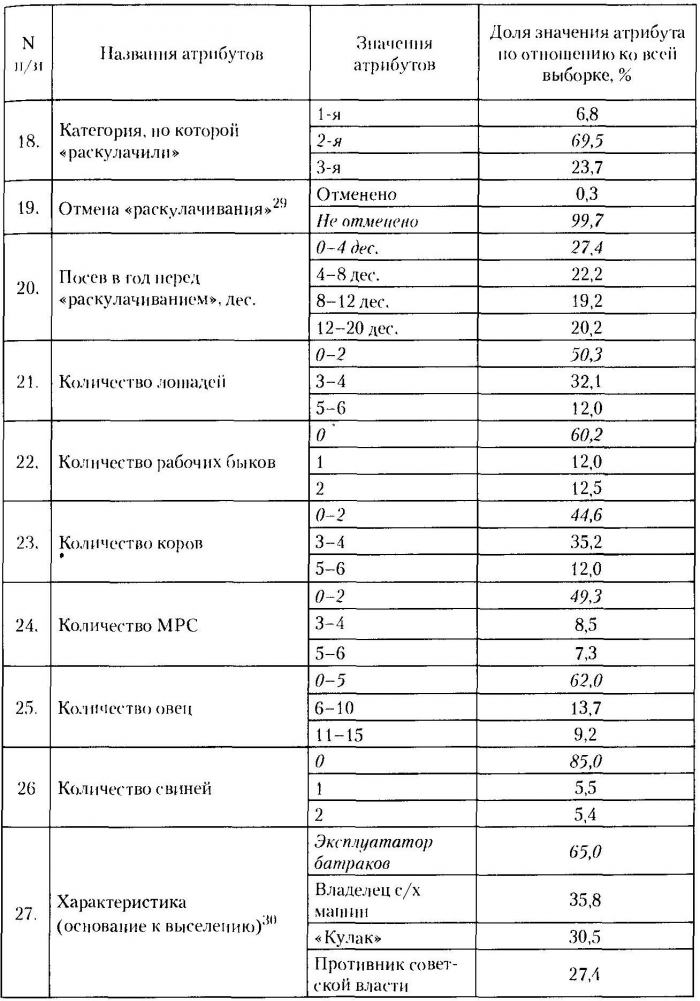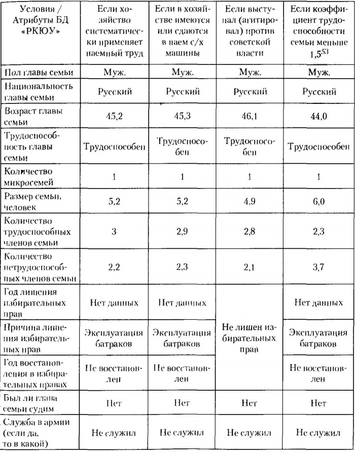 31 В табл. 3 приведены «результативные» значения данного атрибута. По 48,6% глав семей, которые были лишены избирательных нрав, нет данных. Количество же лишенных избирательных прав в 1929 г. (108 глав семей) в БД «РКЮУ» близко значению 1930 г. (129).
