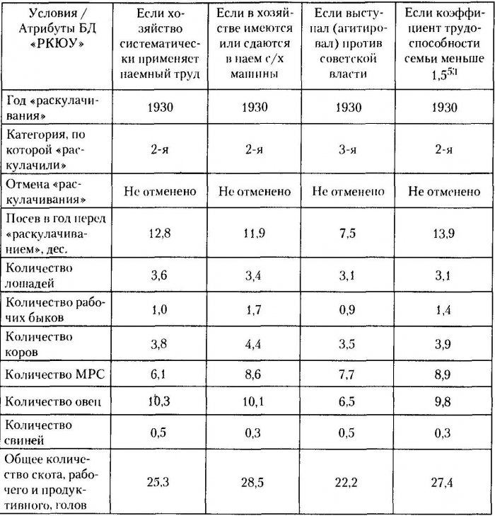 Наше исследование также показывает, что по данным, относящимся к 1930 г., доля «раскулаченных» не по признакам зажиточности приближалась на Южном Урале к 50%. Это объясняется известной советской практикой: несмотря на установленные лимиты, считалось «хорошим тоном» планы перевыполнить. Отметим также, что согласно директиве Политбюро ЦК ВКП(б) «О мероприятиях по ликвидации кулацких хозяйств в районах сплошной коллективизации» от 30 января 1930 г. общая численность «раскулаченных» хозяйств устанавливалась в пределах 3-5% от всех крестьянских хозяйств50. Создается иллюзия, что кампания по «раскулачиванию» проходила по плану и не захватывала середняков и бедняков. Однако, по данным последней динамической переписи, проведенной ЦСУ в 1929 г., доля «кулацких» хозяйств только по РСФСР сократилась с 3,9% в 1927 г. до 2,2% в 1929 г.51 К концу 1929 г. по всей стране оставалось менее 600 тыс. семей, отнесенных к «кулацким», то есть в 1,5 раза меньше, чем 2 года назад52. В приведенной далее таблице рассмотрены социальные портреты «раскулаченных» крестьян, реконструированные на основе анализа БД «РКЮУ». Во втором и третьем столбцах указаны причины «раскулачивания», согласно Постановлению СНК СССР от 21 мая 1929 г., причем в третьем столбце фактически объединены две причины, а четвертый и пятый столбцы дают представление о тех, кто был «раскулачен» в нарушение существовавших на тот момент нормативно-правовых актов.