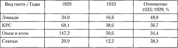 Как видно из предлагаемой академиком А. А. Никоновым таблицы, где приведены данные о динамике падения количества скота, наибольший урон к 1933 г. понесло поголовье овец и коз, их осталось практически треть, а наименьший — хотя и относительно — КРС, его поголовье сохранилось более чем наполовину. По горькой иронии эти данные были озвучены И. Сталиным на XVII съезде ВКП(б) в разделе «Подъем сельского хозяйства»58.