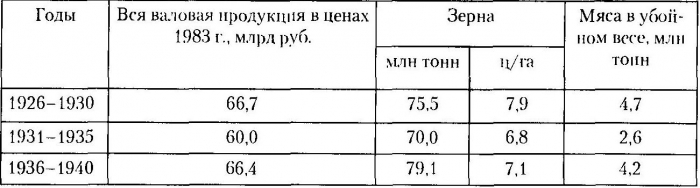 Ссылаясь на цифры ЦСУ СССР, приведенные в табл. 7, можно сделать вывод, что уровень валовой продукции, как и урожайность зерна, после коллективизации и «раскулачивания» 1930-х гг. в предвоенное время так и не вышли на объемы 1926-1930 гг., экономически более благополучных в результате нэпа.