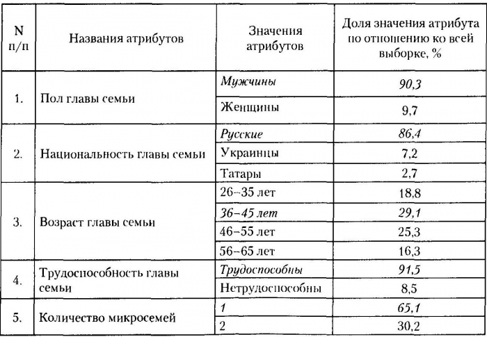 Рассмотрим сделанную нами естественную выборку по БД «РКЮУ» в статистическом разрезе, представленном в приведенной ниже таблице, где курсивом выделены доминирующие значения (абсолютные или относительные) различных атрибутов и их доля в выборке.
