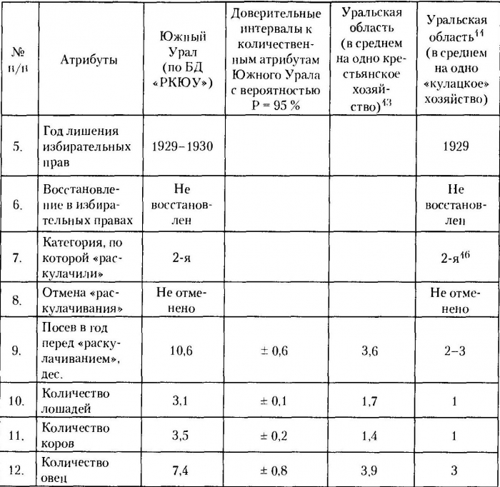 Учитывая, что данные средних атрибутов Т. И. Славко и А. Э. Беделя по «раскулаченным» хозяйствам Уральской области оказались ниже, чем аналогичные значения по не «кулацким» хозяйствам того же региона накануне коллективизации, нам представлялось необходимым построить доверительные интервалы, что и было сделано. Тем не менее прокомментируем возможные причины расхождений.