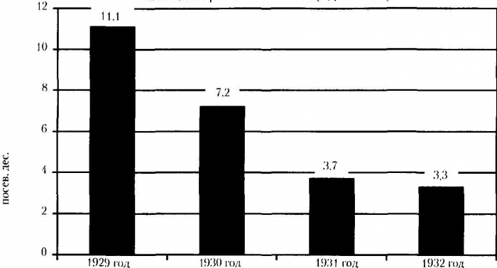49 Гистограмма начинается с 1929 г., т. к. посев в БД «РКЮУ» отражается в год перед «раскулачиванием>>. Завершается же она 1932 г., потому что 1933 г. представлен в БД «РКЮУ» незначительно. Из данных по посеву в 1930 и 1931 г. были изъяты завышенные показатели по Магнитному району Троицкого округа.