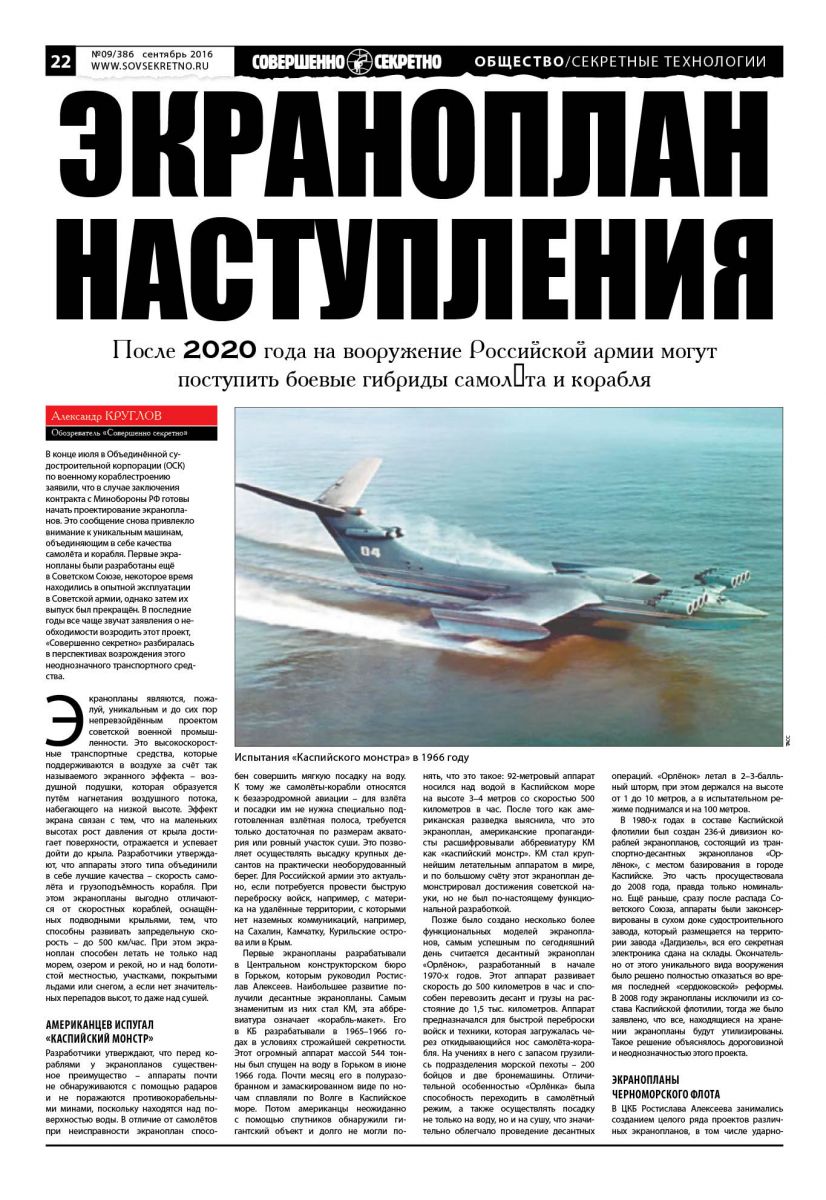 В конце июля в Объединённой судостроительной корпорации (ОСК) по военному кораблестроению заявили, что в случае заключения контракта с Минобороны РФ готовы начать проектирование экранопланов. Это сообщение снова привлекло внимание к уникальным машинам, объединяющим в себе качества самолёта и корабля. Первые экранопланы были разработаны ещё в Советском Союзе, некоторое время находились в опытной эксплуатации в Советской армии, однако затем их выпуск был прекращён. В последние годы все чаще звучат заявления о необходимости возродить этот проект, «Совершенно секретно» разбиралась в перспективах возрождения этого неоднозначного транспортного средства.