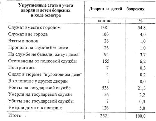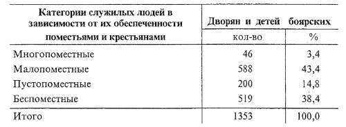 Таким образом, свыше половины всех служилых новгородских дворян и детей боярских в середине 60-х годов XVII в. не имело ни единого крестьянского двора. Более того, почти 40% служилых людей вообще не имели поместий, а их боеготовность полностью зависела от выплат государева денежного жалованья.
