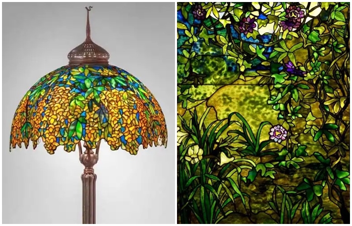 Разрабатывая культовую лампу Tiffany, Louis Comfort Tiffany задался целью создать светильник, который обладал бы одновременно потрясающей красотой и простой функциональностью. Его особенно интересовала игра с цветом и текстурой стекла, чтобы оживить традиции американского декорирования интерьеров в прямом и переносном смысле. На типичном абажуре от Тиффани может быть изображён сверкающий рой стрекоз, энергичный рост весенних цветов или переплетение виноградных лоз, созревших для сбора. Эти узоры воплощаются в жизнь благодаря гармоничному сочетанию смелых цветов, которые умело играют с контрастными и взаимодополняющими оттенками.