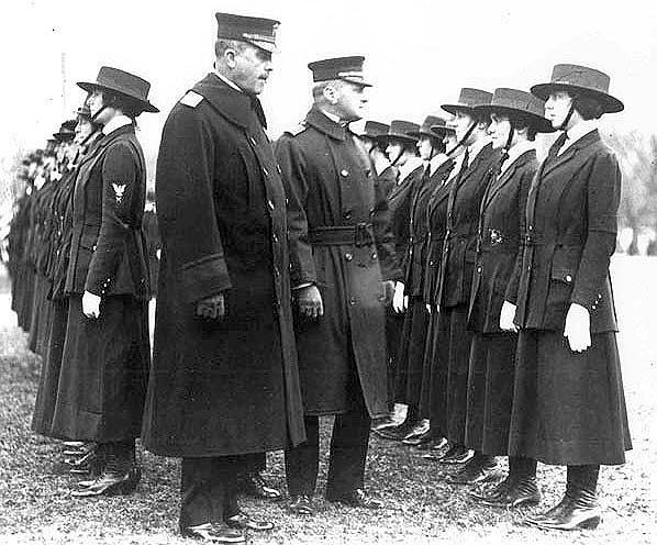 Контр-адмирал Виктор Блю (в центре слева), начальник Бюро судоходства США, 1918 год. Во время войны женщины были официально зачислены в ряда военнослужащих США. Американские ВМС создали резервные силы,которые позволяли женщинам исполнять обязанности радистов, медсестер и другие вспомогательные должности