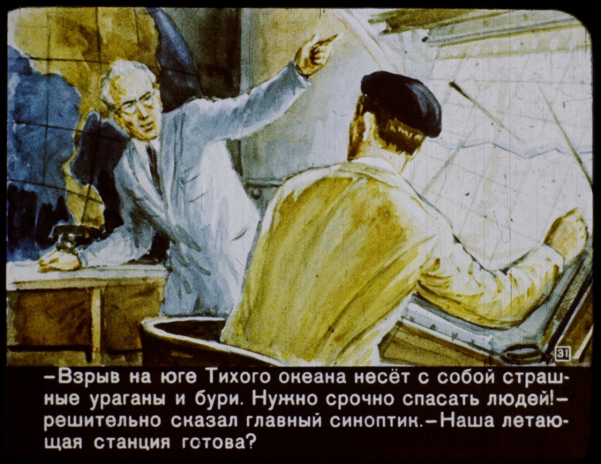 Диафильм показывает и политические взгляды того времени: воцарился мир, а последние империалисты и милитаристы к 2017 году должны были укрыться на далёком острове.
