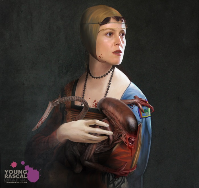 В портфолио графической студии Young Rascal появились недавно совершенно очаровательные постеры с портретами классических киногероев в образе "еще более классических" картин. Сигурни Уивер в образе Дамы с горностаем (да только вместо горностая у нее покоится на руках маленький Чужой), Хеллбой, играющий на лютне, робот R2D2, бросивший путешествия по звездным галактикам ради карьеры художника – эти картины прекрасны. Проект получил название "Movie Remakes".