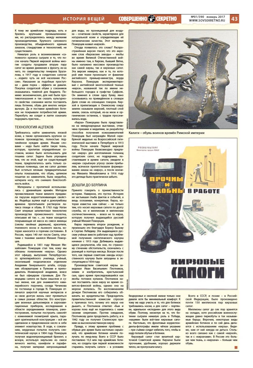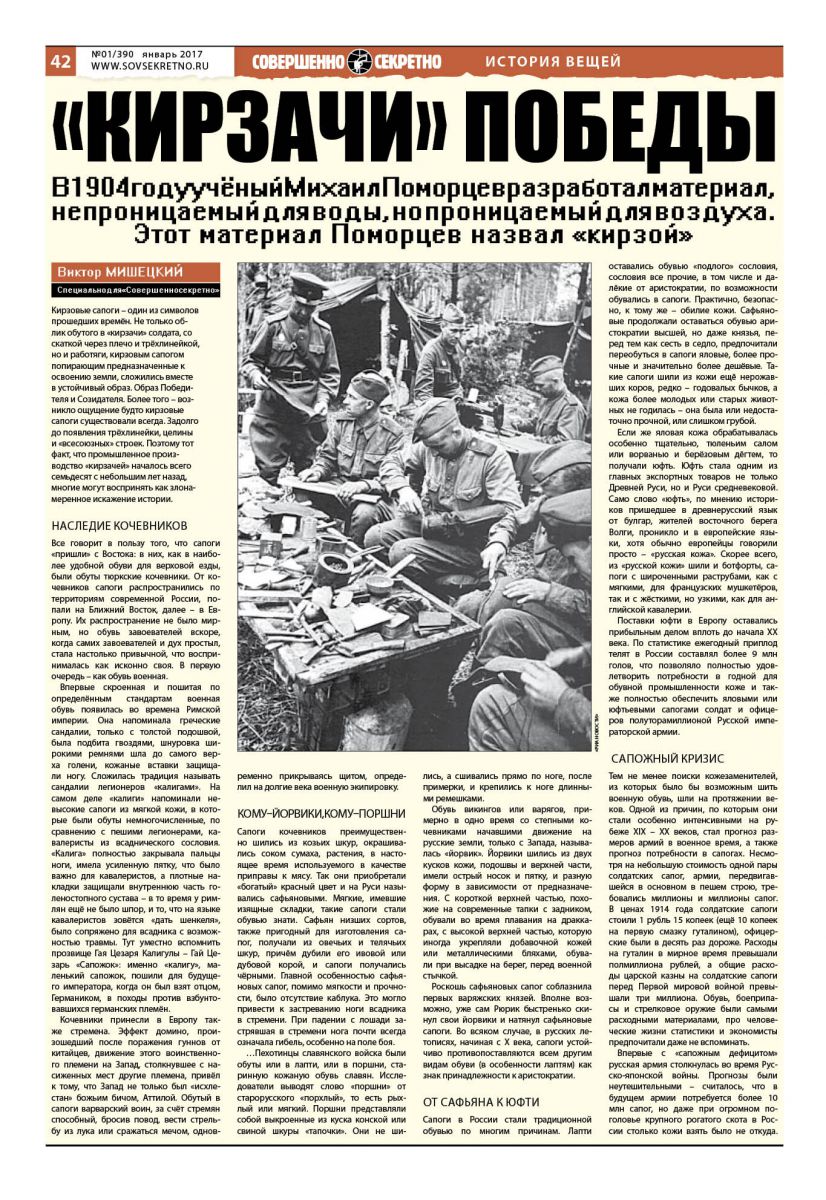 Принято говорить о преемственности истории. Наверное, это пустое. История не застывшая глыба фактов и событий, а вещь осязаемая, конкретная. Кирза, которая известна нам сейчас – не только тем, кто носил кирзовые сапоги по долгу службы, но и миллионам и миллионам соотечественников, – вовсе не та кирза, которую получил выдающийся русский учёный Михаил Поморцев.