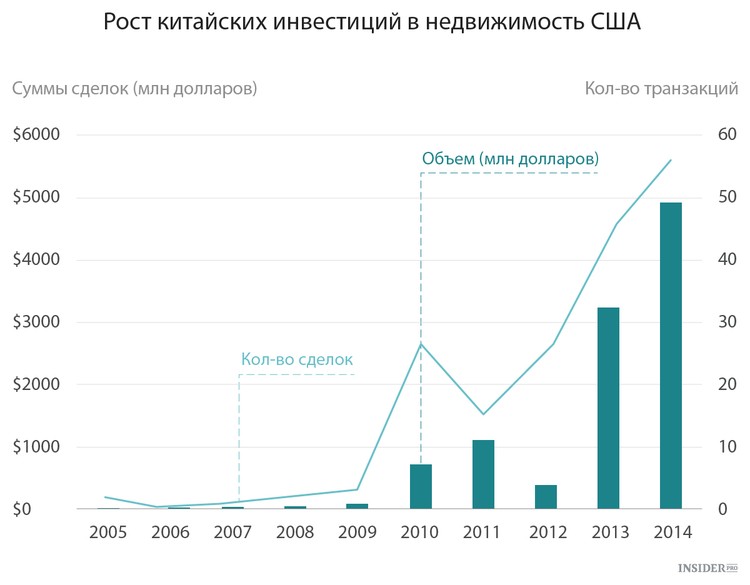 Но транспортом дело не ограничивается. Соединенные Штаты стали важным направлением китайских инвестиций в недвижимость. Это в первую очередь знаковые коммерческие объекты, например, Waldorf Astoria в Нью-Йорке (покупается за 1,95 млрд долларов компанией Angbang Insurance) и Chase Manhattan Plaza (725 млн долларов, компания Fosun). Но еще большие суммы вкладываются богатыми китайцами в жилую недвижимость.