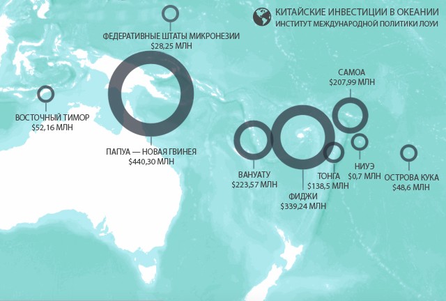 Китай стремится к доминированию не только в Южно- и Восточно-Китайском морях, но и на просторах Океании. По данным Института международной политики Лоуи, транспортные проекты составляют большую часть 2,5 млрд долларов китайских инвестиций в регионе. Среди проектов: