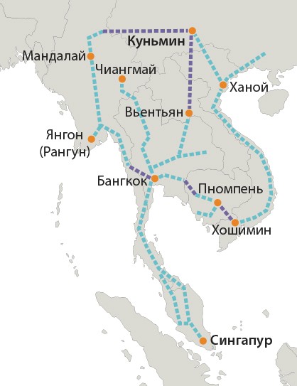Ну суше Китай хочет провести сеть скоростных железных дорог. Отправной точкой послужит Куньмин, столица провинции Юньнань, из которой дороги потянутся через Лаос в Камбоджу, Малазию, Бирму, Сингапур, Таиланд и Вьетнам.