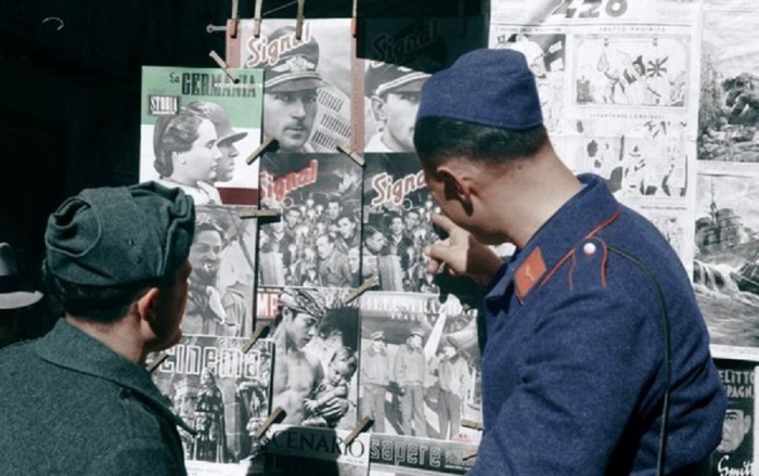 Солдаты, рассматривающие обложки новых немецких журналов.