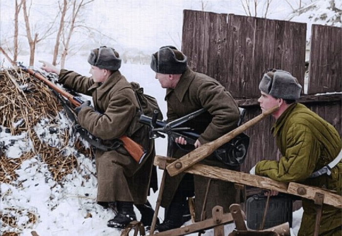 Солдаты на боевой позиции в деревне во время битвы под Москвой.