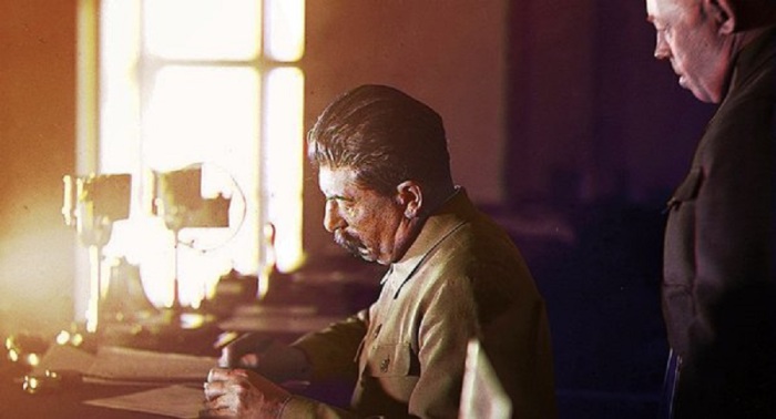 Иосиф Виссарионович Сталин, подписывающий указ о немедленном наступлении советских войск.