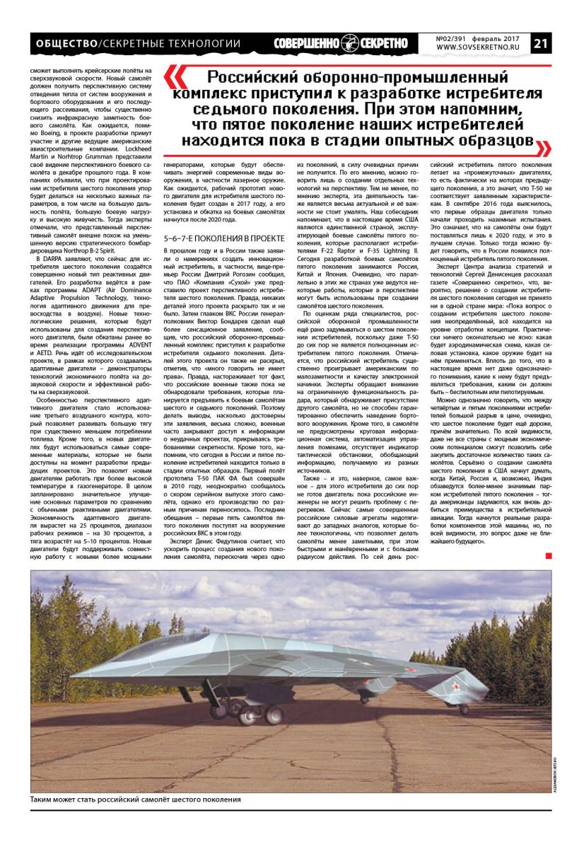 Правда, никаких деталей этого проекта раскрыто так и не было. Затем главком ВКС России генерал-полковник Виктор Бондарев сделал ещё более сенсационное заявление, сообщив, что российский оборонно-промышленный комплекс приступил к разработке истребителя седьмого поколения. Деталей этого проекта он также не раскрыл, отметив, что «много говорить не имеет права».
