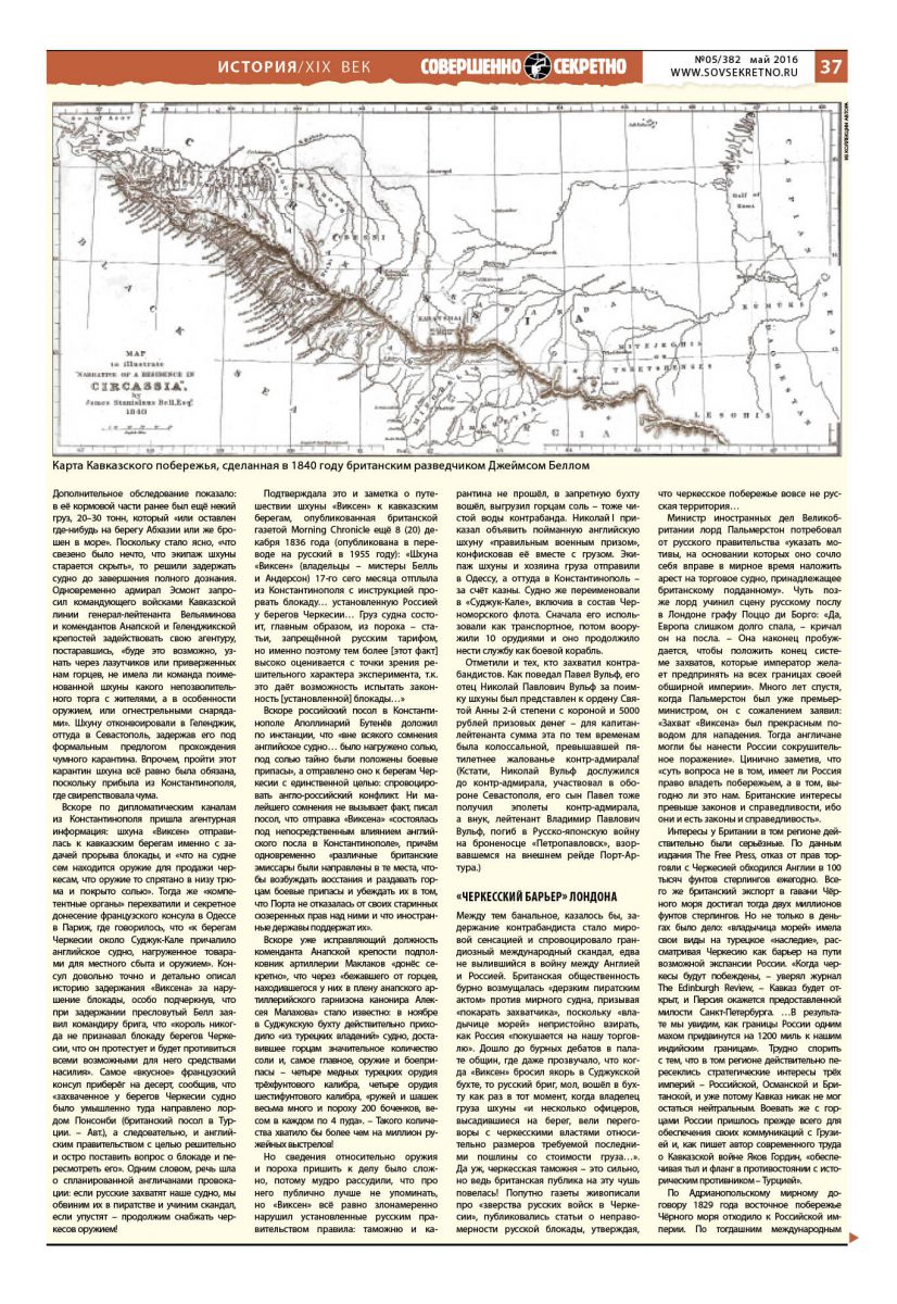Подтверждала это и заметка о путешествии шхуны «Виксен» к кавказским берегам, опубликованная британской газетой Morning Chronicle ещё 8 (20) декабря 1836 года (опубликована в переводе на русский в 1955 году): «Шхуна «Виксен» (владельцы – мистеры Белль и Андерсон) 17-го сего месяца отплыла из Константинополя с инструкцией прорвать блокаду… установленную Россией у берегов Черкесии… Груз судна состоит, главным образом, из пороха – статьи, запрещённой русским тарифом, но именно поэтому тем более [этот факт] высоко оценивается с точки зрения решительного характера эксперимента, т. к. это даёт возможность испытать законность [установленной] блокады…»