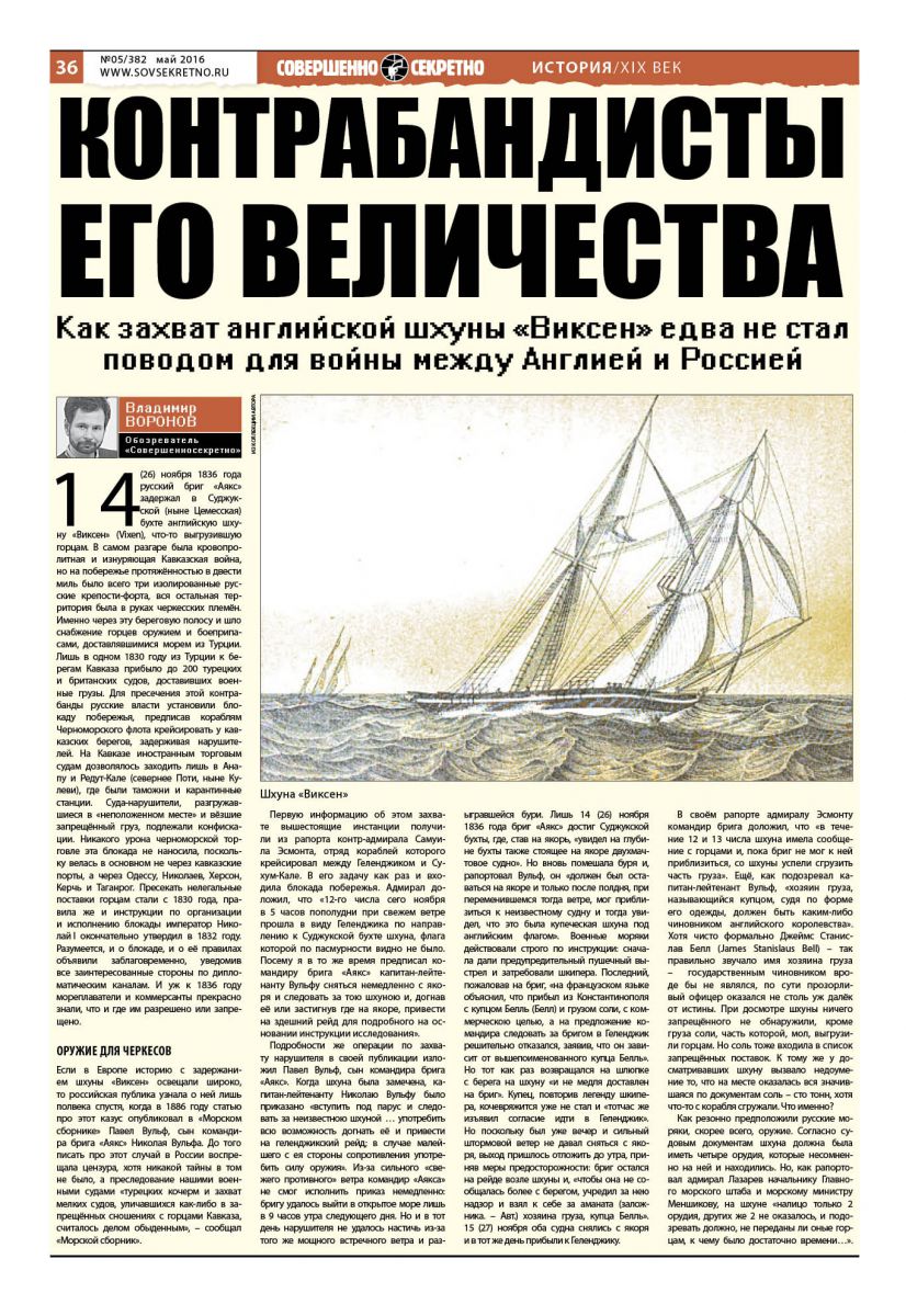 Подтверждала это изаметка опутешествии шхуны Виксен ккавказским берегам, опубликованная британской газетой Morning Chronicle ещё 8 (20) декабря 1836года (опубликована впереводе нарусский в1955году): Шхуна Виксен (владельцы мистеры Белль иАндерсон) 17-го сего месяца отплыла изКонстантинополя синструкцией прорвать блокаду установленную Россией уберегов Черкесии Груз судна состоит, главным образом, изпороха статьи, запрещённой русским тарифом, ноименно поэтому тем более [этот факт] высоко оценивается сточки зрения решительного характера эксперимента, т. к. это даёт возможность испытать законность [установленной] блокады