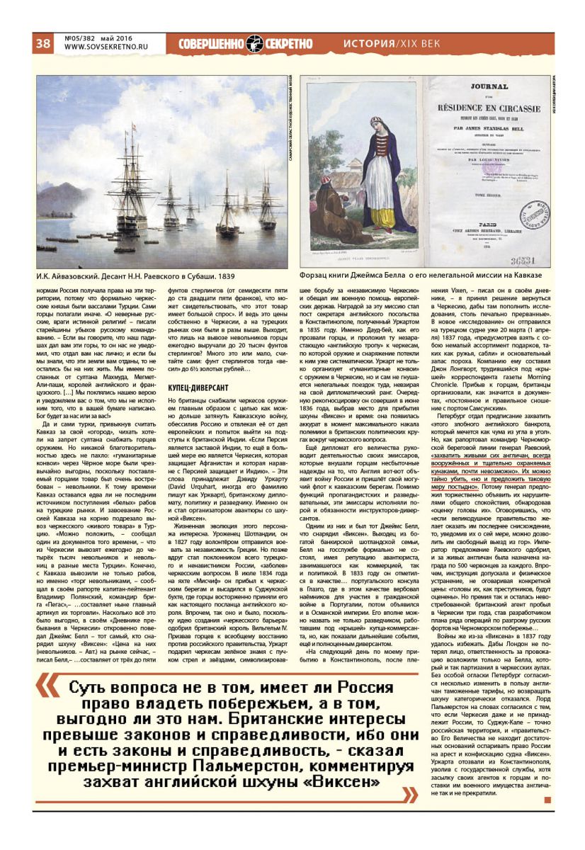Вскоре подипломатическим каналам изКонстантинополя пришла агентурная информация: шхуна Виксен отправилась ккавказским берегам именно сзадачей прорыва блокады, ичто насудне сем находится оружие для продажи черкесам, что оружие тоспрятано внизу трюма ипокрыто солью. Тогдаже компетентные органы перехватили исекретное донесение французского консула вОдессе вПариж, где говорилось, что кберегам Черкесии около Суджук-Кале причалило английское судно, нагруженное товарами для местного сбыта иоружием. Консул довольно точно идетально описал историю задержания Виксена занарушение блокады, особо подчеркнув, что при задержании пресловутый Белл заявил командиру брига, что король никогда непризнавал блокаду берегов Черкесии, что он протестует ибудет противиться всеми возможными для него средствами насилия. Самое вкусное французский консул приберёг надесерт, сообщив, что захваченное уберегов Черкесии судно было умышленно туда направлено лордом Понсонби (британский посол вТурции. Авт.), аследовательно, ианглийским правительством сцелью решительно иостро поставить вопрос облокаде ипересмотреть его. Одним словом, речь шла оспланированной англичанами провокации: если русские захватят наше судно, мы обвиним их впиратстве иучиним скандал, если упустят продолжим снабжать черкесов оружием!