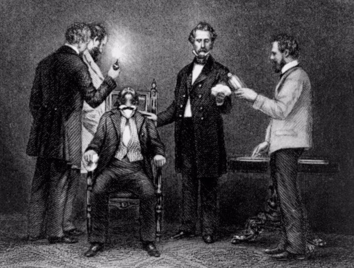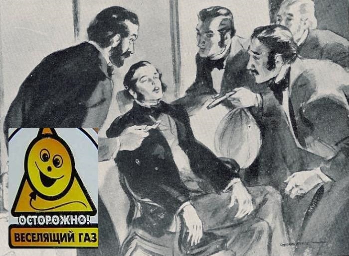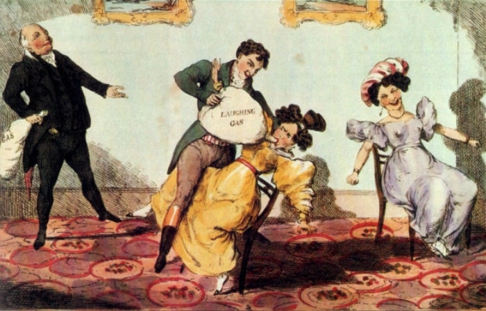 В конце XVIII в. химики впервые получили закись азота и описали опьяняющие и обезболивающие свойства этого вещества, получившего название «веселящего газа». Хэмфри Дэви обратил внимание на то, что вдыхание оксида азота не только облегчает зубную боль, но и заметно улучшает настроение. Медики не восприняли это заявление всерьез, зато Дэви начали одолевать желающие испробовать на себе действие этого чудесного средства.