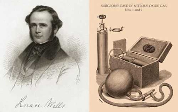 В 1844 г. американский дантист Гораций Хорас Уэллс посетил лекцию химика, демонстрирующего публике свойства оксида азота. Один из добровольцев так развеселился, что сильно ушиб ногу и даже не заметил этого. Веселящий газ становился настолько популярным, что его стали применять в развлекательных представлениях. Уэллс решил использовать этот газ в своей врачебной практике.