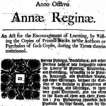 После превращения Англии в буржуазную монархию под давлением предпринимателей, недовольных монополией на книжном рынке, в 1694 году Stationers’ Company была лишена своих монопольных прав. В условиях конкуренции требовался закон, разграничивающий права авторов и книготорговцев. Так, в 1710 году был принят первый в мире закон об авторских правах. Права авторов в данном случае служили, однако, не самоцелью, а лишь антимонопольным инструментом. Полное название закона “An Act for the Encouragement of Learning, by vesting the Copies of Printed Books in the Authors or purchasers of such Copies, during the Times therein mentioned”, но обычно его называют просто «Статут Анны», по имени правившей тогда королевы. Действие авторских прав ограничивалось 28-ю годами, после чего работа переходила в общественную собственность (public domain). Издатель, купивший текст, получал право монопольно издавать его в течение 14 лет с возможностью продления этого права ещё на 14 лет в отдельных случаях.