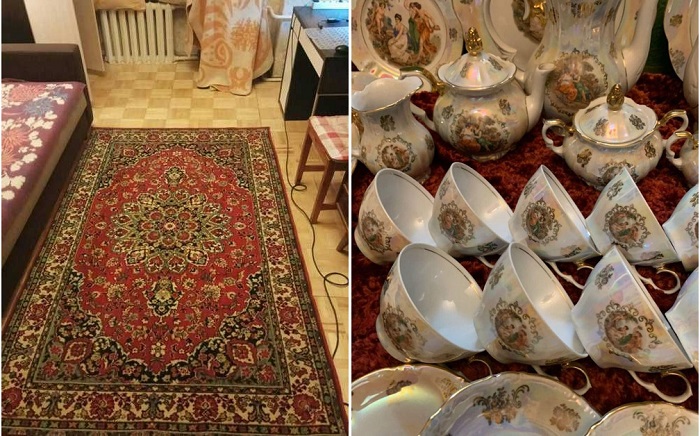 Ну и куда же без ковров. Их не только клали на пол, но и вешали на стены. Делали ковры из натуральной шерсти, плетение было очень качественным, а рисунки оригинальными. Чаще всего это были восточные мотивы, которыми славятся персидские ковры.Оттенки могли быть самыми разнообразными, но преобладали красные и кирпичные. Квартира, засланная коврами, не удивляла никого. Чем больше ковров — тем лучше. Значит, в семье есть достаток и возможность купить дефицитные вещи. Ходили по коврам без тапочек, оставляя их у двери. Для чистки использовали обычный пылесос. При переезде на новое место жительства ковры свёртывали в трубочку, заматывали тканью, например, старой простыней, и они следовали вместе с людьми на новую квартиру. Сегодня стоимость советских шерстяных ковров очень велика и достигает ста тысяч рублей и более. Конечно, многие изделия уже поедены молью, но можно найти и экземпляры в великолепном состоянии.