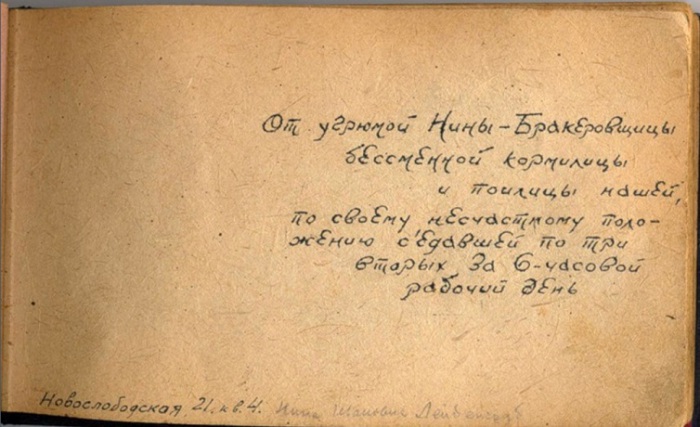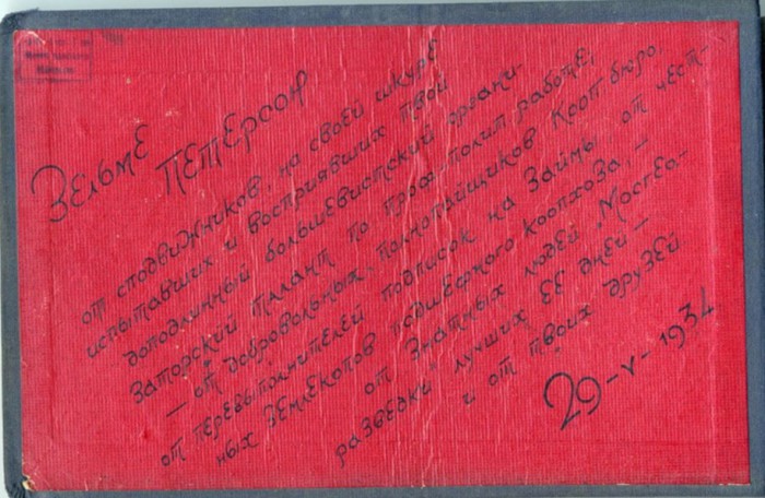 Владелицей этого альбома была Зелме Петерсон. В 1927 году она работала в тресте «Мосгеоразведка» и на общественных началах была редактором стенгазеты, председателем месткома, а затем и освобожденным главой профсоюза Треста. В 1934году её муж Ян Петерсон окончил МВТУ им. Баумана и получил назначение на строительство Сталинградского тракторного завода. Когда Зелма с детьми уезжала к месту назначения Яна, коллеги по Тресту пришли на вокзал проводить их и вручили маленький альбомчик. В нём вся трагическая история семьи, которая попала в огонь репрессий страшного 1937.