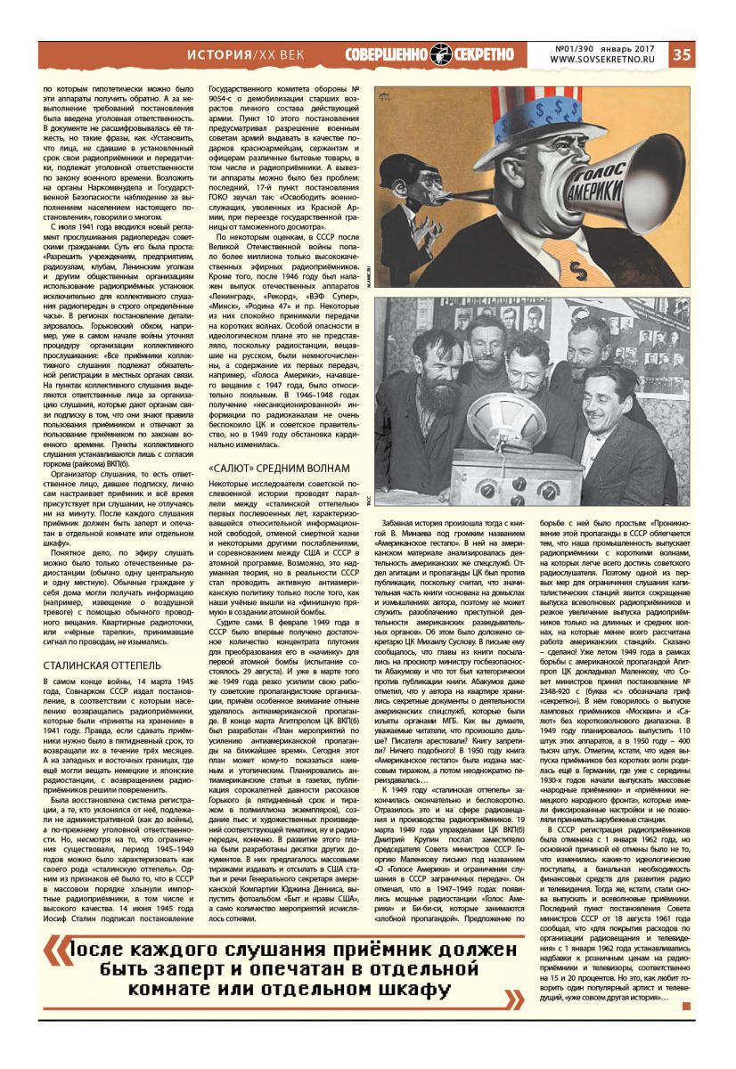 Дмитрий Крупин послал заместителю председателя Совета министров СССР Георгию Маленкову письмо под названием «О «Голосе Америки» и ограничении слушания в СССР заграничных передач». Он отмечал, что в 1947–1949 годах появились мощные радиостанции «Голос Америки» и Би-би-си, которые занимаются «злобной пропагандой». Предложение по борьбе с ней было простым: «Проникновение этой пропаганды в СССР облегчается тем, что наша промышленность выпускает радиоприёмники с короткими волнами, на которых легче всего достичь советского радиослушателя. Поэтому одной из первых мер для ограничения слушания капиталистических станций явится сокращение выпуска всеволновых радиоприёмников и резкое увеличение выпуска радиоприёмников только на длинных и средних волнах, на которые менее всего рассчитана работа американских станций». Сказано – сделано! Уже летом 1949 года в рамках борьбы с американской пропагандой Агитпроп ЦК докладывал Маленкову, что Совет министров принял постановление № 2348-920 с (буква «с» обозначала гриф «секретно»). В нём говорилось о выпуске ламповых приёмников «Москвич» и «Салют» без коротковолнового диапазона. В 1949 году планировалось выпустить 110 штук этих аппаратов, а в 1950 году – 400 тысяч штук. Отметим, кстати, что идея выпуска приёмников без коротких волн родилась ещё в Германии, где уже с середины 1930-х годов начали выпускать массовые «народные приёмники» и «приёмники немецкого народного фронта», которые имели фиксированные настройки и не позволяли принимать зарубежные станции.