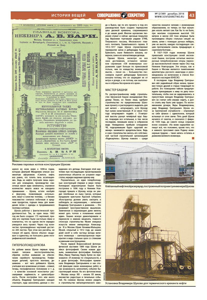 Считается, что Пушкин сразу явил себя как Пушкин, во всей полноте гения. Так и Шухов явил себя, приступив к инженерной работе сразу как Шухов, во всем блеске новаторских решений, многие из которых опережали время. Он не проектировал того, что могло бы быть использовано непосредственно, частным потребителем. Скажем такие немаловажные вещи, как мясорубки или швейные машины. Его разработки закладывали основы индустрии будущего, а главным в его работе было то, что Шухов решал стоящие перед ним задачи комплексно, рассматривал возникающие проблемы как систему, не ограничивался одним звеном проблемной цепочки.