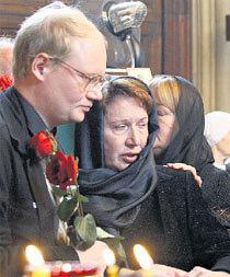 | Дочь Пуговкина Елена с сыном Михаилом на похоронах отца, 29 июля 2008 года |